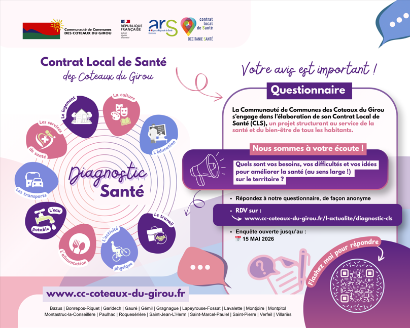Nouvelle actualitéDans le cadre du projet social de territoire et de l’élaboration de son Contrat Local de Santé (CLS), la Communauté de Communes des Coteaux du Girou lance une enquête auprès des habitants.